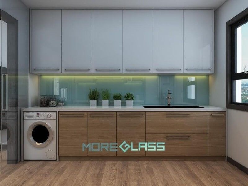 Mẫu thiết kế nội thất bếp đơn giản cho chung cư theo gam màu nhẹ nhàng với kính ốp bếp màu xanh lơ MG-019 thanh mát.