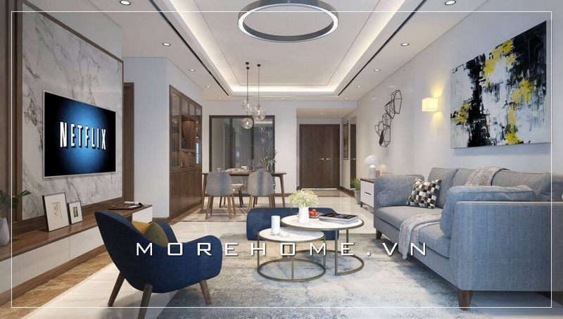 Mẫu thiết kế chung cư hiện đai nổi bật với bộ sofa màu xám xanh hài hòa trong tổng thể nền tường màu trắng.