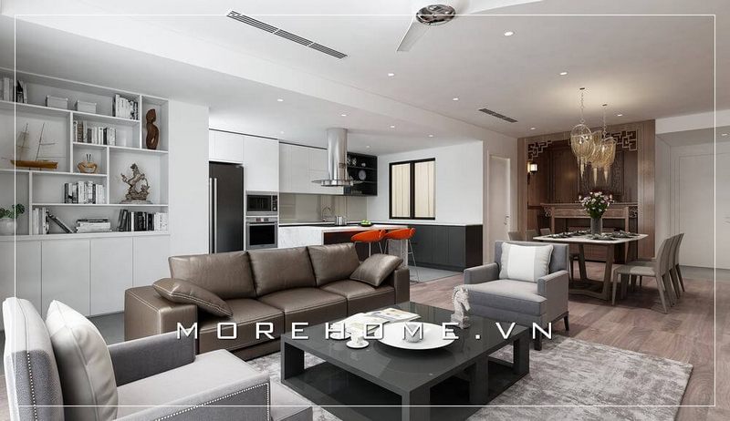 Mẫu thiết kế nội thất chung cư hiện đại, nổi bật với bộ sofa da cao cấp cùng cách sắp xếp nội thất khoa học mang đến sự thông thoáng cho không gian sống của căn nhà