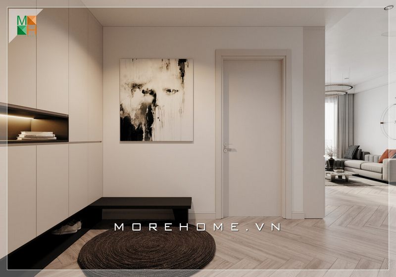 Căn hộ có khu sinh hoạt chung để đồ đạc của cả gia đình gọn gàng, dễ lựa chọn nhờ thiết kế hệ thống tủ kịch trần âm tường màu trắng tạo sự rộng rãi trong căn hộ hiện đại.