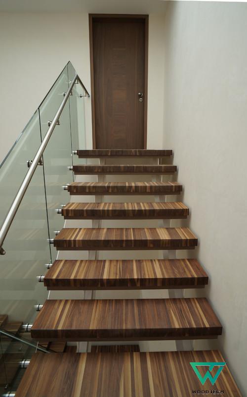Cầu thang gỗ óc chó hiện đại kiểu Mỹ WT - 0004 tạo sự ấn tượng không hề nhỏ với vân gỗ gần như tương đồng với nhau tạo nét hài hòa hiếm có trong thiết kế cầu thang gỗ đặc biệt là go oc cho kết hợp lan can kính tạo nét tinh tế đẹp mắt. Khi sự kết hợp khéo léo giữa gam màu trong suốt của chất liệu kính cường lực kết hợp với gam màu trầm của gỗ óc chó giúp không gian như tăng thêm nét tương phản giúp không gian như có chiều sâu vậy.